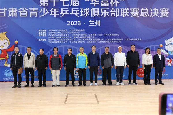 第十七屆“華富杯”甘肅省青少年乒乓球俱樂部聯(lián)賽總決賽由甘肅省乒乓球運動協(xié)會、華富信息集團(tuán)主辦;甘肅華富云動文化體育產(chǎn)業(yè)有限公司承辦;蘭州新區(qū)西岔園區(qū)管委會、甘肅財貿(mào)職業(yè)學(xué)院、華體健隴(甘肅) 體育發(fā)展有限公司、蘭州藍(lán)大健康管理有限公司、巍雅斯名表眼鏡有限公司協(xié)辦;甘肅華富云米酒店管理有限公司、蘭州天躍體育文化用品有限公司、甘肅眾享醫(yī)聯(lián)體集團(tuán)、甘肅達(dá)爾健康復(fù)醫(yī)院、蘭州百事飲料有限公司、中良西服有限公司、蘭州蟹王閣、蘭州虹云賓館有限責(zé)任公司支持。